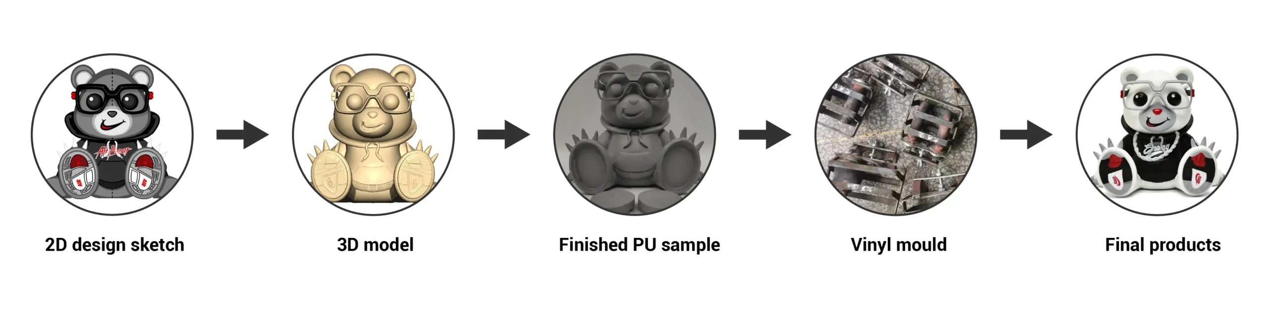You only need to provide your design as well as the design files(Vector files are the best) for the logo and patterns, then inform us of your vinyl toy dimensions and order quantity, choose the packaging solution, and the rest will be completed by us. Throughout the entire process, you only need to participate in the quality review.
